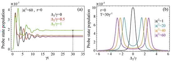 Among other parameters, Equation (12) depends also on time. Therefore, in order to study the behavior of the probe state population as a function of , one should first make a choice of the interaction time during which the driven system is exposed to the radiation. In Figure 3a, we plot as a function of time for various detunings and . Under this choice of parameters, we notice that the population of the probe state reaches its steady-state value at about . Numerical investigations of the behavior of as a function of time for different combinations of the parameters , , r, and revealed that the choice of always guarantees that the system is well within its steady-state regime. Therefore, we adopt this choice of time for the calculations throughout the paper. In Figure 3b, we plot as a function of for various and parameters corresponding to a coherent state. Note that, as expected, for , the distribution does not depend on the choice of . We confirm that as increases and the mean Rabi frequency becomes larger than the spontaneous decay rate , the single peak structure (black line) splits into two peaks forming the well-known Autler–Townes doublet structure [44]. The distance between the two peaks is equal to the mean Rabi frequency , which is proportional to the square root of the mean photon number of the coherent state . As long as is smaller than , the increase of will result in power broadening of the profile [67] until it splits into the doublet.