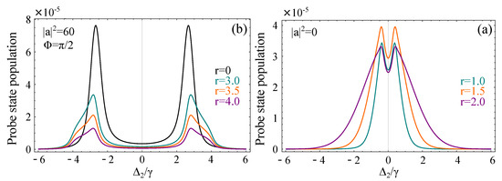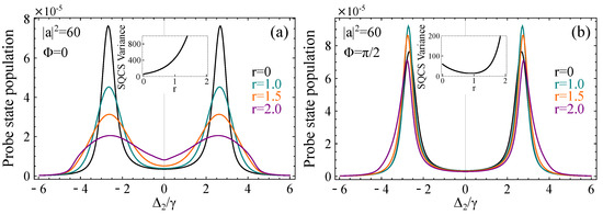 In Figure 4a, we plot the population of the probe state as a function of for various degrees of squeezing and . The splitting profile shows great sensitivity to the value of the squeezing parameter r, becoming significantly broader as the latter increases. The physics behind this broadening of the profile is related to the strong amplitude fluctuations of the field that are translated into fluctuations in the value of the Rabi frequency of the transition that cause partial smearing of the doublet structure after taking the average over the SQCS distribution. However, as seen in Figure 4b, under the same choice of parameters, but with , the profile only slightly deviates from the profile exhibited under coherent state driving (). An effective way of interpreting this sensitivity on the phase difference is through the form of the SQCS photon number variance. In particular, the photon number variance of the SQCS is given by the relation [68]: