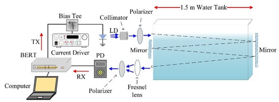 For this paper, we constructed the basic architecture of a UWOC system, as shown in Figure 1. At first, the bit error rate test set (BERT) (Anwayer V8, up to 1.5 Gbps data rate) was used to generate NRZ-OOK with PRBS of 7, 24, or 31 formats to measure the signal difference at lower speed and higher speed than 1.5 Gbps. Then, we modulated the 450 nm blue light laser (OSRAM, PL450B) via the Bias Tee (ZZX85-12G-S+). The laser had a peak output power of 80 mW and reached a peak wavelength of 450 nm at 25 °C. The current source (ILX Lightwave LDC3722) was operated at 80 mW to reach the optimal 450 nm blue light source. A collimating lens was used to focus the laser beam and then passed through the 1.5 m length water tank with a width of 0.3 m and a height of 0.3 m, respectively. A Fresnel lens was used to focus the beam, and polarizers were used to improve the system performance. A photodetector (Menlo, APD 210) with a high bandwidth up to 1000 MHz and responsivity of 5A/W at the central wavelength of 450 nm was used. Finally, the optically converted electronic signal was sent to the BERT for system performance evaluation. Mirrors were used to multiple reflect the laser to extend the total transmission length by made the laser light reflected back and forth in the water tank.