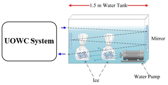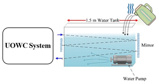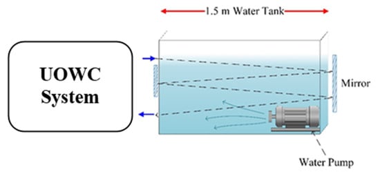 UWOC systems usually mean river or sea where there is flowing water. Therefore, the submerged motor is used to simulate the water flow (turbulence). The maximum water output is set up to 1200 L per hour. The output water flow can be stabilized to simulate water flow, as shown in Figure 2.