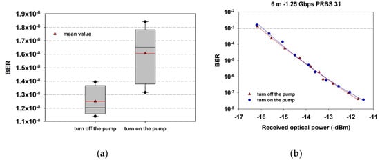Transmission distance of 6 m (a) bit error rate box plot of the motor pump is on/off, and (b) bit error rate against received power when the motor pump is on/off.