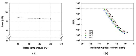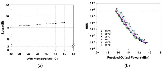 Transmission distance of 6 m (a) water versus optical loss, and (b) received power against the bit error rate under different temperatures.
