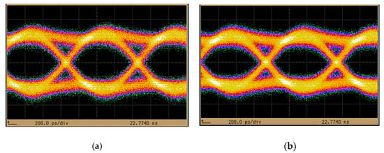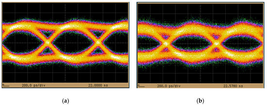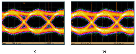 In this experiment, the water was heated from room temperature 25 °C, 35 °C, 40 °C, 45 °C and 50 °C, and the water temperature was kept constant. The received optical power was measured by the optical power measurement. The results of water temperature and optical loss are shown in Figure 5a. The total loss of signal light increases with the increase of water temperature after 6 m of transmission. The transmission loss is 5.18 dB at 35 °C. When the water temperature is 50 °C, the total transmission loss is 8.93 dB. The difference in optical signal loss is 0.42 dB when the temperature rises to 15 °C. Therefore, when the water temperature rises, the optical transmission loss is more significant than at room temperature. Next, the PD is used to receive the signal and measure the bit error rate, as shown in Figure 5b. It can be seen that the fluctuation of BER is more severe with the increase of water temperature up to 50 °C compared with 25 °C. The reasons may be attributed to the water molecules being more active at a higher temperature. In addition, the temperature distribution is nonuniform in the water tank and the optical propagation path. Prior work [] demonstrated, lower scintillation index, higher signal-to-noise ratio, and lower BER at 25 °C water temperature. Simultaneously, the eye diagrams shown in Figure 6a,b indicates that the system has better performance at 25 °C water temperature compared to 50 °C, with larger eye-opening and less time jitter. Nevertheless, the power penalty is little. It means that water temperature variation has little influence on UWOC performance.