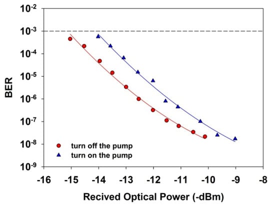 The medium used in this experiment is clear tap water, but the tap water is not pure. When the signal light is transmitted in the water tank, it can be seen that there are some suspended particles in the light path. When the motor is turned on, these impurities will quickly float in the water in the whole tank, and more particles can be seen on the signal light path while the floating speed is faster. The optical power of the signal light before entering the water tank is 3.516 dBm. After three reflections of blue light in the water tank, the total transmission distance is 6 m, and the received optical power is −4.604 dBm. The water pump is turned on with 1200 L per hour. In 6-m transmission, the BER values varied to some extend due to water flow, as is shown in Figure 3a.
