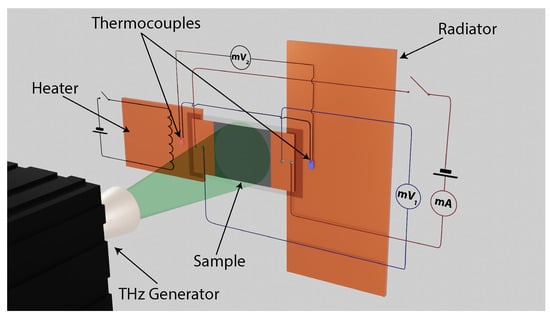 In the experiment, the Terasense 140 GHz source of terahertz radiation (IMPATT diode with a power of 36.8 mW (measured using Gentec-EO THZ9B-BL-DA piroelectric detector), conical horn F-band antenna, gaussian beam shape, divergence angle of 7°, aperture diameter of 10.4 mm, gain of 25 dB) was used []. The radiation homogeneity was studied with INO Microxcam-384i camera, which has a pixel size of 35 μm (384 × 288 pixels) and NEP of 26.3 pW × Hz−1/2. Thus, the intensity distribution was obtained, which is approximately uniform. The THz radiation with an intensity of 0.43 mW/mm2 illuminated the entire area of the sample (bismuth-antimony thin film; see Figure 1 and Figure 2) which was attached to copper plates. A Fluke 8840A multi-meter with the resolution of 1 μV was connected to the sample. A 1.5 V galvanic cell was also connected to the sample through a 5 kΩ resistor. The left copper plate was acting as a heater; a heating element was attached to it, as well as a thermocouple, which was used to control the temperature gradient. A Keithley 2001 multi-meter with the resolution of 1 μV was used to measure the thermocouple voltage. The right plate was used to cool the sample to room temperature. The THz radiation power measured behind the structure under study does not exceed 2%. The THz radiation source and the sample were covered by a box with a slot for ventilation of the THz emitter to stabilize the temperature and protect the setup from air flows and background infrared radiation. Thus, three types of influence were applied to thin bismuth-antimony film: THz radiation, direct current, and temperature gradient.