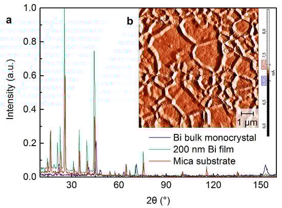 (a) X-ray diffraction (XRD) patterns for Bi(111) bulk monocrystal, 200 nm Bi film, and mica substrate. The bifurcated peak at 153° indicates the (111) film plane crystallographic orientation. (b) Atomic force microscopy (AFM) image of a 200 nm Bi film surface.