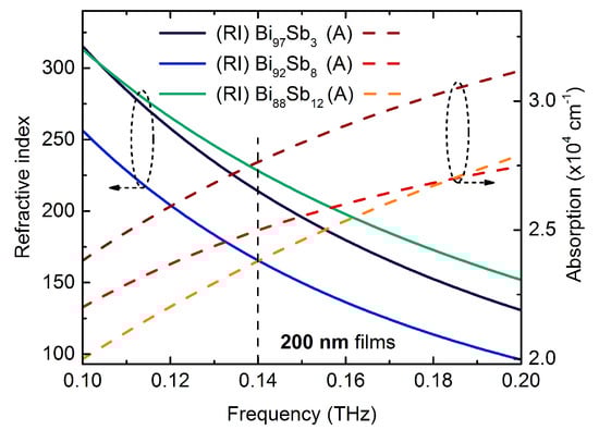 Refractive index (solid lines) and absorption coefficient (dashed lines) dispersions of 200 nm Bi1−xSbx films in 0.1–0.2 THz frequency range for various Sb concentrations []. The vertical line at 0.14 THz represents the frequency point for parameters values used in further calculations.