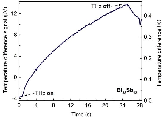 In the first experiment, no current was flowing through the sample, the gradient furnace was switched off, so that the sample was out of electric field and the temperature throughout the sample was the same. During the experiment, temperature gradient was revealed while materials were affected by THz radiation. Temporal dependence of temperature gradient on duration of radiation influence is presented in Figure 5. In case of long exposure with constant power radiation, the temperature gradient kept changing, but with a low rate. Despite absence of thermal gradient and electric field, the signal still could be received. The values of temperature difference signal lie in the range between 4 and 13 μV under these conditions.