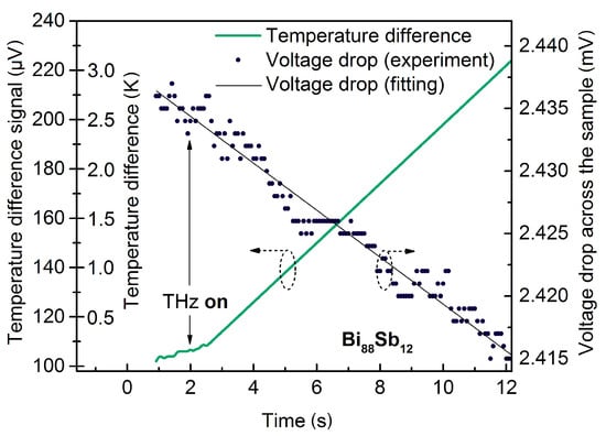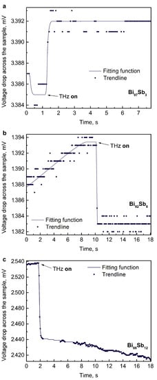 In the second experiment, 1.5 mA direct current was flowing through the sample, gradient furnace was switched off; thus, the sample was in the electric field, but the temperature throughout the sample was the same. In Figure 6, there are temporal dependencies for the next compositions: Bi97Sb3, Bi92Sb8, Bi88Sb12. Initially, voltage drop across the sample was measured without radiation. Then, radiation was switched on at the time point designated in Figure 6. After a very short time interval (comparable with voltmeter measurement rates), voltage drop change can be seen. For Bi97Sb3 film (Figure 6a), this effect is not very significant. For approximately 2 s, there was a voltage drop decrease, i.e., conductivity increase, and, afterwards, voltage drop increases, i.e., conductivity decreases. For Bi92Sb8 (Figure 6b) and Bi88Sb12 (Figure 6c) films, the effect had the same direction but different values. During the first seconds of the experiment, voltage drop changes linearly due to thermoelectric effect induced by flowing current. With THz radiation turning on, voltage drop decreases, which means that conductivity increases in these films. In Bi92Sb8 and Bi88Sb12, films the effect is similar to photoconductivity in semiconductors.