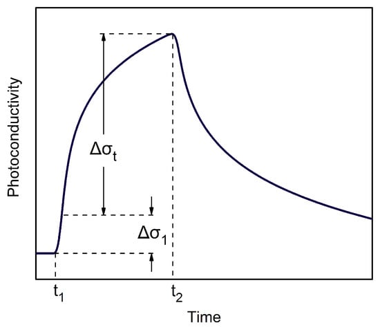 A typical curve of increase and decrease in photoconductivity for crystal with traps is demonstrated schematically in Figure 8. Charge carrier concentration increases during the time period defined by the recombination time. Due to excess electron and hole concentration, the conductivity increases by