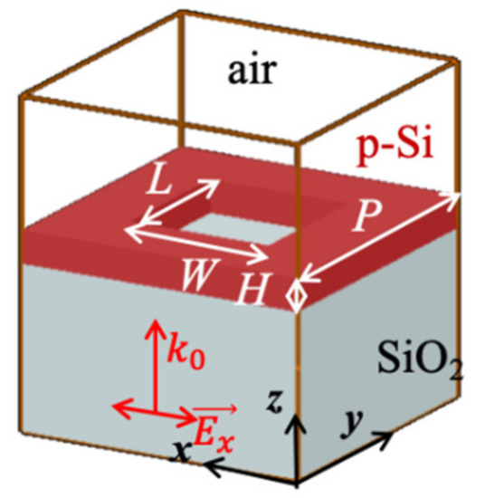 In the study, the optical simulations are based on the finite-difference time-domain (FDTD) algorithm with the commercial software package FDTD solutions provided by Lumerical Solutions, Inc., and the thermal simulations are based on the finite element method with the software Device from the same company. In optical simulations, the x-/y-axis boundaries of the unit-cell (in Figure 1) are periodic boundary conditions, and the top and bottom boundaries (z-axis) were perfectly matched layer boundary conditions. The source, all objects, and monitors were limited in the simulation region. In thermal simulations, the x-/y-axis boundaries were set as “closed”, and the z-axis boundaries were set as “shell”. All the optical and thermal parameters of the materials came directly from the software’s database.