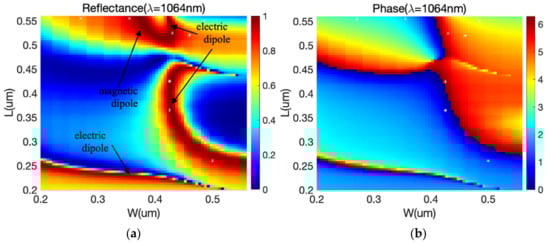 The unit-cells of nanostructures with the phase coverage of 0–2π are the fundament of designing the phase-control metasurfaces. By tailing the parameters (length L and width W) of nanoholes, the rules of tuning silicon nanoholes’ reflectance and phase are obtained via numerical simulations. As the height H of the Si film is 200 nm and the lattice constant P is 600 nm, the corresponding reflectance and phase of reflected light are reported in Figure 2. It is seen in Figure 2a that a near-100% reflectance can be obtained by choosing suitable values of L and W. There are several high-reflection strips in Figure 2a, which come from the electromagnetic resonances of the nanoholes. According to the electromagnetic distributions, the resonances can be divided into two groups: electric dipoles and magnetic dipoles, as indicated by the arrows. The electromagnetic behavior of nanoholes comes from the coupling between the electric/magnetic dipoles of the nanoholes in the lattice with photonic crystal radiation [38]. More details of the electromagnetic modes will be further analyzed when discussing the eight selected nanoholes (marked by the stars *) with the 0–2π phase coverage. Figure 2b shows that the 0–2π phase coverage can be achieved by tuning the nanohole size. For intense-light applications, except for the reflectance and phase coverage, the electric field distribution in the unit-cells that compose the reflective metasurfaces is also very important.