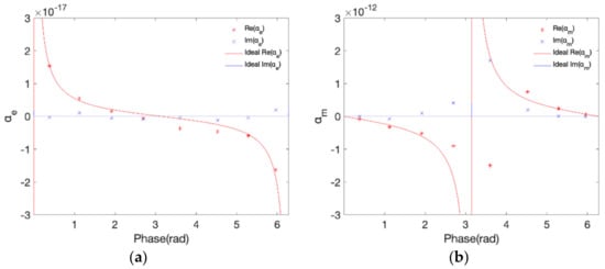 Electromagnetic polarizabilities of the 8 selected unit-cells: (a) effective electric polarizability ; (b) effective magnetic polarizability . The solid curves are the electromagnetic polarizabilities of an ideal reflective Huygens source with phase covering the 0-2π range.