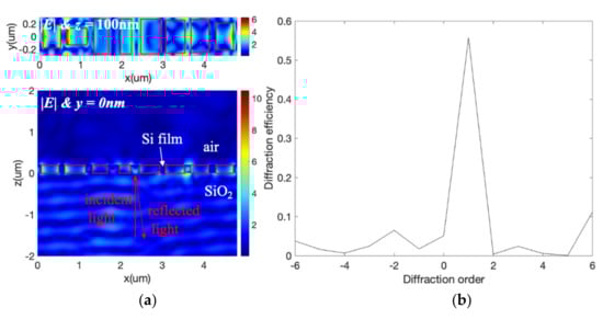 Beam-steering performance of the reflective meta-deflector: (a) local electric field distributions on the x-y plane with z = 100 nm and on the x-z plane with y = 0. The red rectangular frames indicate the nanoholes in the silicon film; (b) reflectance of the different diffraction orders of the meta-reflector.