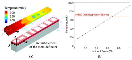 The electric field distribution only shows the anti-damage potential of the meta-deflector qualitatively. For quantitative analysis, some optothermal simulations are conducted to estimate the maximum laser intensity that the meta-reflector can handle. Figure 6a shows the temperature distribution in the unit element (its structure is presented as an inset image, which is composed of the 8 selected unit-cells in Table 1, area: 0.6 µm × 4.8 µm = 2.88 µm2) of the meta-deflector illustrated by a plane-wave laser with power 0.53 W. The unit-cells have similar temperature values from 1160 K to 1320 K. Under the illumination of different incident powers, the maximum temperature values in the 3D volume made of the unit element are reported in Figure 6b; 1683 K is the melting point of silicon. It is shown that the meta-deflector can handle the maximum laser power (0.68 W per 2.88 µm2), i.e., the laser density of 0.24 W/µm2.