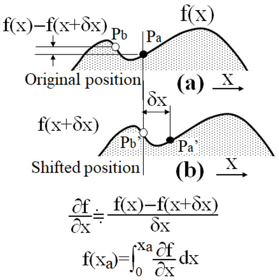 The cross-section of the measured object is shown in Figure 1. In Figure 1a, the phase cross-section of the speckle pattern is shown when the measured object is set to the original position of the speckle interferometer. In Figure 1b, the phase cross-section of the speckle pattern is set at the time when the measured object is shifted by a small amount (δx). When a specklegram is calculated between these two speckle patterns, the phase change at each position can be analyzed with high resolution using speckle interferometry. Assuming that the phase distribution related to the shape of the measured object is f(x), as shown in Figure 1a, the phase change caused by the lateral shift (δx) at Pa in the original position is the difference between Pa and Pb, i.e., f(x) − f(x + δx). If this phase change is divided by the shift (δx), the pseudo-differential value (∂f/∂x) of the phase distribution f(x) related to the shape can be obtained, as shown in Figure 1. By integrating this differential value with respect to the shifted coordinates, the phase distribution f(x) related to the shape of the original object can be obtained.