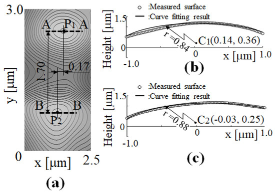 Although the measured silica object includes some irregular spheres, most of the objects are approximately spherical, as shown in Figure 4. The vertex of the silica sphere can be easily estimated by observing the contour map shown in Figure 7a. Considering that the measured object is a sphere, it can be assumed that the horizontal cross-section, including the vertex on the contour map, is the cross-section of the sphere. Thus, the A–A and B–B cross-sections that include P1 and P2 can be set parallel to each x-coordinate. Therefore, the cross-section of the sphere can be easily obtained. Furthermore, as shown in Figure 4, a 3D estimation method based on the exact calculation of the diameter was not selected because the width of the diameter distribution is between 1 and 4 μm and silica objects are not necessarily ideal spheres. The measurement results by two-dimensional curve (circle) fitting on the cross-section using the least squares method instead of the 3D fitting method were evaluated to estimate the radius and center position of the object.