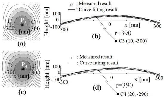 In the same manner as that for the results (C-C) in Figure 10b, the shape of the cross-section (D–D) centered on P4 in Figure 10c was estimated by curve fitting to determine the radius. A radius of 390 nm and center position C4 (20, −290) were estimated by curve fitting, as shown in Figure 10d. The results are approximately in agreement with the results shown in Figure 10b. This confirms the effectiveness of the proposed method, which can be used to measure the shape of a fine structure for a randomly distributed even if the diffraction limit is exceeded.