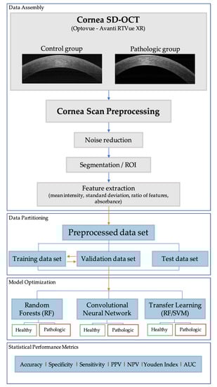 Figure 1 shows the workflow of experiments performed in the study. All corneal SD-OCT analyses were performed by the same technician (SIS). SD-OCT is a conventional imaging diagnostic tool in ophthalmology clinics that helps study the microstructural changes of different eye pathologies, including the cornea [32]. SD-OCT provided non-contact in-vivo corneal cross-sectional, high-resolution images. The Avanti RTVue XR (Optovue®, Fremont, CA, USA) SD-OCT corneal module permitted a high-speed acquisition of image frames (1024 axial scans in 0.4 s) with little motion artifacts, reducing background noise. This device worked at a wavelength of 830 nm and a speed of 26,000 A-scans per second [33]. All the experiments were performed on a dataset comprising cross-line morphologic corneal images belonging to a random set of corneal pathologies. This set of images was compared to healthy corneas (control group). The problem was confronted using binary classification methods. The quest illustrated three approaches: