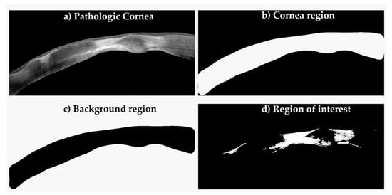 Cornea Scan Postprocessing: Digital SD-OCT images are usually contaminated with noise inherited from the sensor (Figure 2a). This problem is easily circumvented by applying a 2D median filter. Nevertheless, in order to extract statistical features from these images, one must do what is known in the imaging domain as image segmentation, which partitions the image into different segments (a.k.a., regions), which are, in our case, three segments (cornea region, background region and region of interest) as shown in Figure 2b–d, respectively. In the figure, the cornea region mask is obtained by applying contrast limited adaptive histogram equalization (CLAHE) followed by fixed thresholding (Figure 2b). The background region is simply the inverse of the mask (Figure 2c). The region of interest (ROI) was obtained using our fast image segmentation method based on Delaunay Triangulations [35,36], which was fully automatic and did not require specifying the number of clusters, as was the case with the k-means clustering [37] or the multilevel image thresholds using Otsu’s method [38] (Figure 2d).