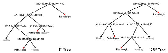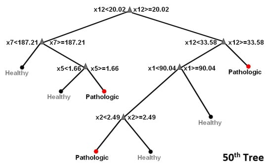 Random forest: The experimental set up to execute RF classification of data into healthy or pathologic images comprised two stages. The bag of decision trees was set to 50 growing trees (this number provides the right balance between the area under the curve (AUC), processing time and memory usage) in the training stage, which was used with a training set of 50 control and 15 pathologic images. The RF constructed decision trees based on the predictive characteristics of the features in Table 1. See also Figure 3 for a visualization of three out of the fifty trees. Figure 4 depicts how RF optimizes its performance across several growing trees (50 trees in our case) by performing out-of-bag (OBD) error calculation. The training phase converged into a model that we used, in the second stage, on a new validation test dataset comprising 21 controls and 7 pathologic images.