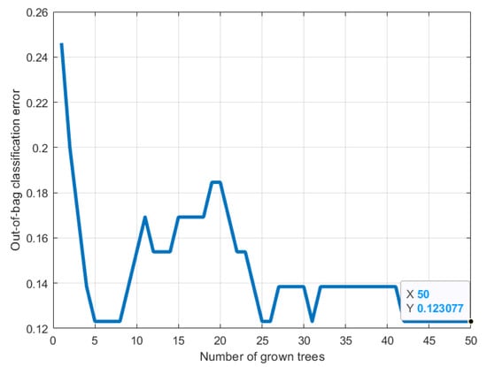 Random forest classification error minimization across the growing trees during training. RF optimizes its performance across several growing trees (e.g., 50 trees) by performing out-of-bag (OBD) error calculation.