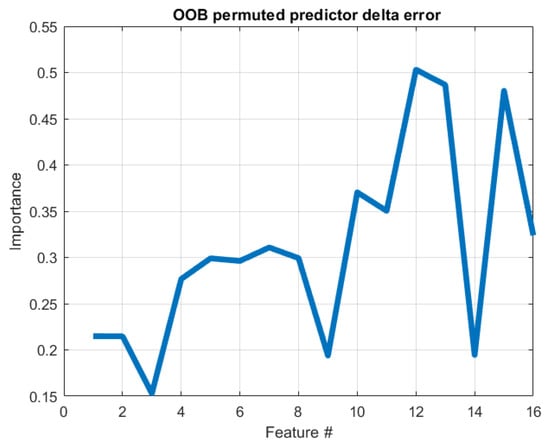 We tested each model sequence’s accuracy to assign the entry as pathologic or healthy. The RF method (AUC = 0.77, SPE 60%, SEN 95%) had the lowest precision in the set (86.07%, ±5.44); however, the model only used 16 possible features extracted from the data, followed by CNN (AUC = 0.84, SPE 77%, SEN 91%). Figure 5 displays the importance of statistical features of images analyzed by RF. The measure represents the increase in prediction error for any given variable if that variable’s values are permuted across the out-of-bag observations. This measure is computed for every tree, then averaged over the entire ensemble, and divided by the standard deviation over the entire ensemble. It appears that features 12, 13 and 15 (i.e., corresponding to columns M, N, P in Table 1) are the most important in this classification model.