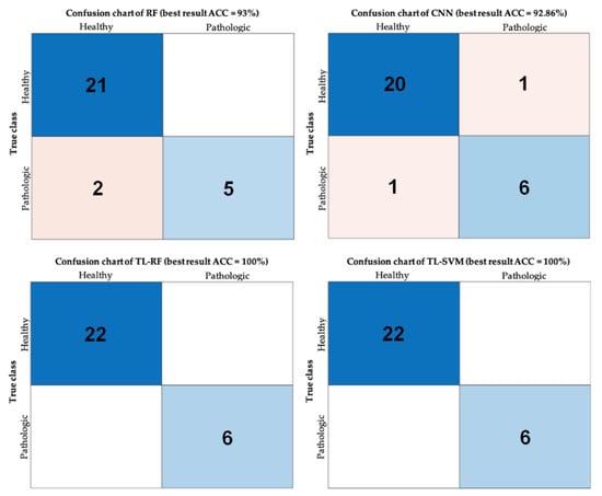 Algorithms that used more (4096) had higher precision. The transfer learning-SVM model yielded the best results (TL-SVM. AUC = 0.94, SPE 88.12%, SEN 100%) followed by the transfer learning-RF model (TL-RF. AUC = 0.92, SPE 84%, SEN 100%). The visualization of this classification’s performance can be further examined in Figure 6 showing the best performing test’s confusion matrices from the 10 random tests for each algorithm. Table 3 summarizes the outcomes of the constructed models.