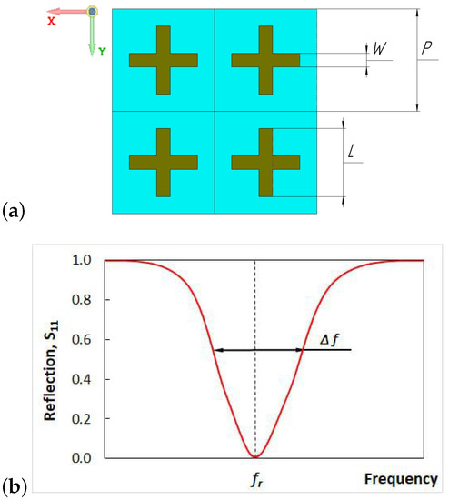 (a) Geometric parameters of a periodic frequency-selective surface: P is a structure period, L is a cross length, and W is a cross width. (b) Typical view of reflection amplitude spectrum: is a resonance frequency, Δf is a bandwidth, that can be found as a bandwidth corresponding to the semiamplitude.