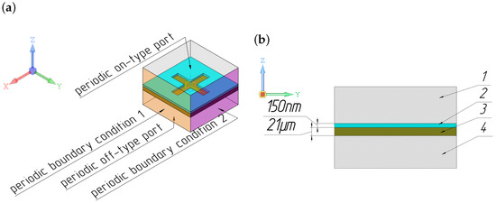 Simulated system is supposed to be the periodic element of a matrix. For that reason, the periodic-type ports and periodic boundary conditions were used in order to model the repeating element of the surface (Figure 2a).