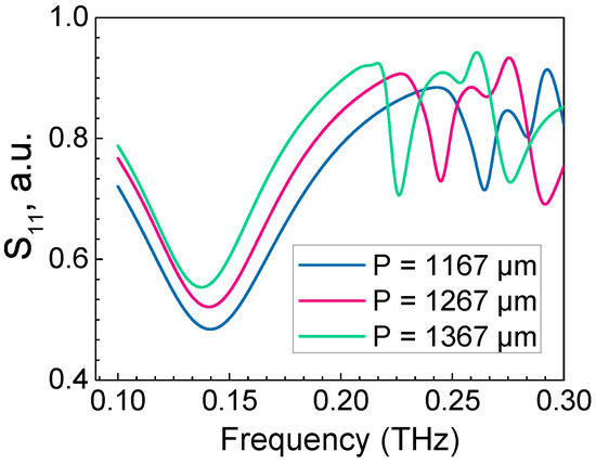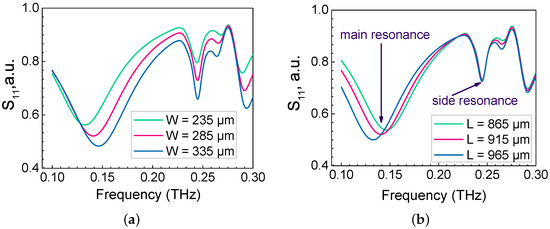 Change in the geometric parameters of the FSS allows the adjustment of the reflection amplitude spectrum [42]. The change of period P, cross width W, and length L changes the position and Q-factor of the resonance.