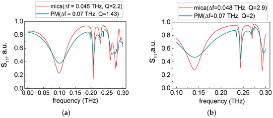 A minimum of reflection can be seen at required frequencies. Q-factor, that depends on the resonance frequency, is higher for the 0.14 THz case: 2 and 2.9 for FSS on PM and mica substrates, respectively. Q-factor for 0.1 THz case equals to 1.43 and 2.2 for FSS on PM and mica substrates, respectively. Side resonances, that correspond to the substrate, are blueshifted by 0.1 THz relative to the main resonance. The impact of substrate is more significant in case of mica substrate usage when the reflection amplitude decreases and the transmission amplitude increases.