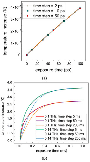 The THz wave period is around 10 ps. For a line of electromagnetic tasks solver step must be lower than the period. As in real conditions, times up to several seconds are under the interest it is required to perform the calculations up to the same times. However, heating process can be examined at time steps higher than the wave period. We made the comparison between three models: (1) with time step lower than the wave period (2 ps), (2) with time step comparable with the wave period (10 ps), (3) with time step higher than the wave period (50 ps). The results can be seen in Figure 6a. No significant change in the results has been traced. Hence, in the case of electromagnetic heating calculation, time steps higher than the wave period can be used.In case of longer exposure, higher time steps are required in order to reduce the calculation time. In Figure 6b temperature increase calculated with higher time steps (1, 100, and 250 μs) is shown. It can be seen that at 500 μs all the curves begin to coincide, and temperature increase function becomes the same for all solutions.