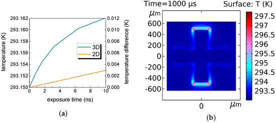 We compared two model types: (1) 3D and (2) 3D with 2D description of the thin film. Time step was 100 ps. The 2D description has been performed using special options: “thin layer” in heat transfer interface and “transition boundary condition” in electromagnetic waves interface. The equations that are used for 2D description are listed in our previous publication [48]. The comparison between temperature change in 2D and 3D case showed that 2D description of film gives a temporal temperature function close to the linear (Figure 7a).The extrapolation of linear function gives unrealistic values of temperature. 3D model gives a function with the closest approximation in the form of natural logarithm. This is in good agreement with Newton’s law of heating (and cooling) [49] that uses exponential growth function with the power containing time and thermophysical properties of the material.