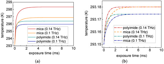 Firstly, we made the comparison between substrates optical properties impact on the resulting film temperature. In this model case, it was necessary to exclude the impact of difference in thermal properties of the substrates. For this purpose, thermal conductivity coefficient was taken equal for mica and polyimide (both equal to 0.5 W·m−1·K−1). The results obtained are shown in Figure 8. In accordance with these calculations, mica substrate causes higher electromagnetic heating of the system.