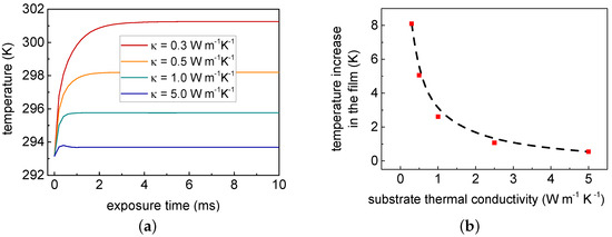 Secondly, we studied the impact of substrate thermal conductivity on temperature in the film. In this model case, we took a substrate with PM optical properties and changed its thermal conductivity in the range from 0.3 to 5 W·m−1·K−1. These values of thermal conductivity are typical for mica and polyimide. Thermal conductivity of the substrate was assumed to be isotropic. Figure 9a shows that decrease of thermal conductivity of substrate results in the increase of thermal response in the film. This is due to the fact that smaller part of heat flux can penetrate into the substrate with low thermal conductivity. The dependence of film temperature on substrate thermal conductivity has a nonlinear behaviour that can be described by a power law (Figure 9b).