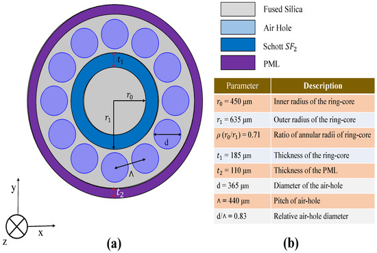 Combining the benefits of the THz wave guidance and OAM transmission, we have designed a circular ring-core PCF (RC-PCF), supporting a large number of OAM modes, ultra-low confinement loss, flat dispersion, and better OAM quality in a broad THz frequency range. The cross-section of the proposed RC-PCF and the corresponding physical notation with description is shown in Figure 1a,b, respectively, with a list of size parameters, where and are the inner and outer radii of the light-guiding ring-core, respectively, and and are the thickness of the ring-core and perfectly matched layer (PML), respectively. The ∧ d are the pitch distance of air holes and the diameter of the air hole, respectively, and the ratio between them is the relative air diameter (d/∧). The PML is used outside the computation domain. The thickness of the PML is around 9% of the whole radius of the cross-section of the fiber. The is named as the ratio of the circular radii of ring-core and expressed through /. By changing this ratio, the number of the supported OAM modes and the quality of the OAM modes are varied. This ratio is used for measuring and comparing the OAM purity for different vector modes that are discussed later. The PCF is composed of a ring-core and a well-ordered layer of an air hole. The light-guiding and mode beam-bearing ring are doped through a high indexed material of Schott with refractive index 1.62 [44] at 1550 nm wavelength. This high indexed ring-core contributes to the well-separated eigenmodes, although there are various types of glass material like LASF and SF11 for doping the light guiding path. But, for the high refractive index and relatively rough dispersion, these are not used for doping. On the other hand, is better for dispersion and internal transmission, which was proved in References [42,43]. Besides, the background material of the proposed RC-PCF is fused silica with a relatively lower refractive index than Schott of 1.446 [45]. The air holes outside the ring-core distribute the refractive index through the whole section of the fiber, which is favorable for tuning the wave-guide dispersion [46]. Since the THz OAM is a new concept of multiplexing system OAM in optical communication, so the structure of a fiber can be simple.