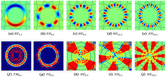 Here, the superscript ‘±’ is denoted as the polarization direction of spin angular momentum. From the above formulas, it can be seen that the rotation direction of HE modes with the direction of spin angular momentum, while the EH modes follow the opposite rotation direction [47,48]. Besides, even and odd modes are obtained after the /2 phase shift and ‘±l’ denotes the rotation direction of the wavefront. The radial orders with m > 1 are not considered because of their disturbance in multiplexing and demultiplexing of OAM modes [44], thus we considered only m equal to 1. By following Equations (1) and (2), the 58 OAM and eigenmodes are supported through the proposed RC-PCF over the whole supported frequency band. These are – , , , , , , , , , , , , , , .