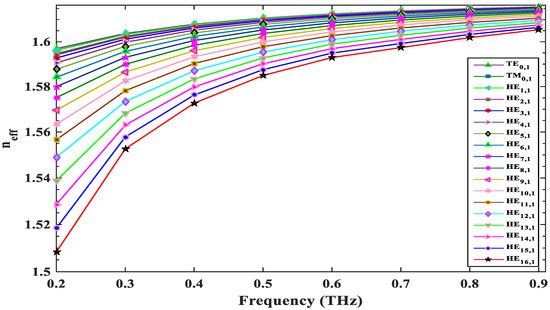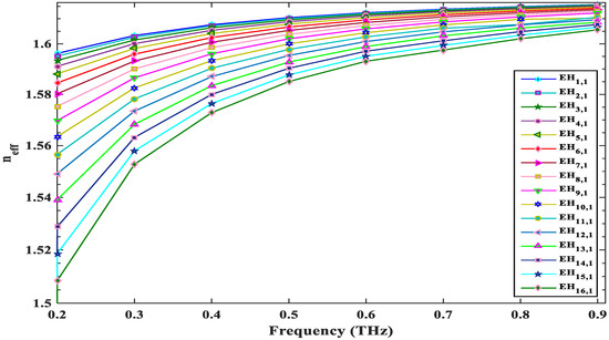 By following Equations (1) and (2), the effective refractive index of every OAM eigenmode is equivalent to the corresponding even and odd vector modes and these are dependent on the operating frequency. To evaluate the modal effective refractive index () of the proposed fiber, numerical simulations and calculations are done by the finite element solver, where a PML is accomplished adjacent to the cladding. The eigenmodes of , and all of the supported HE modes are shown in Figure 3, besides all of the EH modes are shown in Figure 4. From both figures, the higher order of OAM modes is clearly represented, showing a lower refractive index, and by increasing the operating frequency, the refractive index is increased. It is known that resonant frequency is ascertained by the optical and geometrical characteristics of the first high-index layer. For guiding the THz OAM transmissions, in Reference [21], two resonant frequencies (0.45 THz and 0.88 THz) are used and analyzed as well as some OAM parameters within a certain frequency of 0.20 THz to 0.90 THz. In this proposed PCF, the refractive index of all the supported modes is calculated over ranges from 0.20 THz to 0.90 THz. The refractive index of all vector modes is between the cladding refractive index (1.446) and the light guiding refractive index (1.62). The dispersion characteristics (in Figure 6) are calculated by using the refractive index.