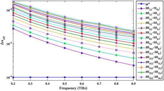 Effective refractive index difference for the same group of OAM modes with respect to operating frequency ranging from 0.20 THz to 0.90 THz.