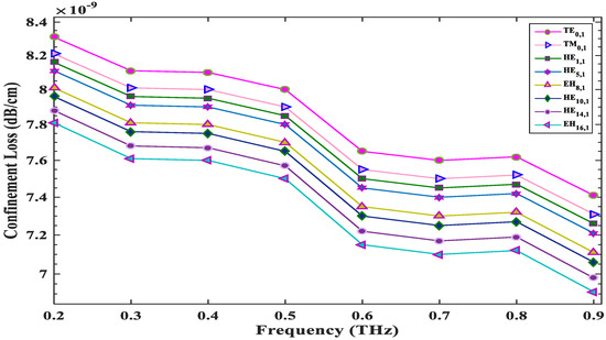 Confinement is the light restricting capability at the core of the PCF. Confinement loss (CL) has occurred for the structural imperfections of the fiber structure. Then it is incited through the interior components of the beam [48]. It is a harmful parameter for optical fiber communication. So, we need it to be as low as possible. For the well-structured PCF and the well-patterned air holes layer, the CL became very low. The CL was evaluated through Equation (5). The calculation of the CL is dependent on the unreal part of the effective refractive index, which is very low for the proposed PCF. It is also dependent on the size of the air holes, layers of the air holes, operating frequency, and the guiding mechanism of the fiber. The calculated values of CL for some of the vector modes of , , , , , , are shown in Figure 7 with respect to operating frequency, ranging from 200 GHz to 900 GHz.