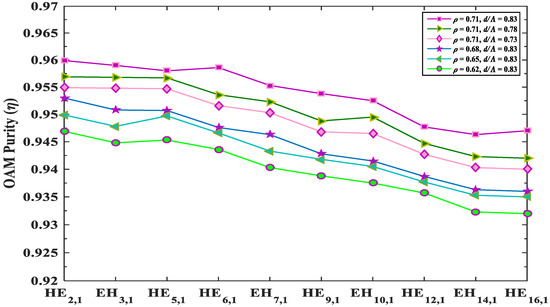 OAM purity is one of the most important parameters for OAM transmissions. The OAM mode purity relates to how light beams are confined in the ring core of the fiber. When a fiber is supported by more numbers of OAM modes, then we should get attention on the purity or quality of OAM modes of this fiber because the high purity of modes ensures the stable transmission of fiber [38]. Mode quality depends on the number of vector modes, the width of ring core, pattern of air-holes, and layer numbers of air-holes. We have determined the values of mode purity for some of the vector modes with respect to the ratio of the annular radii of the ring core () and the relative air-hole diameter (d/∧) of the proposed RC-PCF. The inner diameter is fixed in Figure 1 for the increment of supported modes, so the outer diameter can change for determining mode purity. We also varied the relative air-hole diameter at the cladding region to evaluate the values of mode purity. It is evaluated through Equation (6).