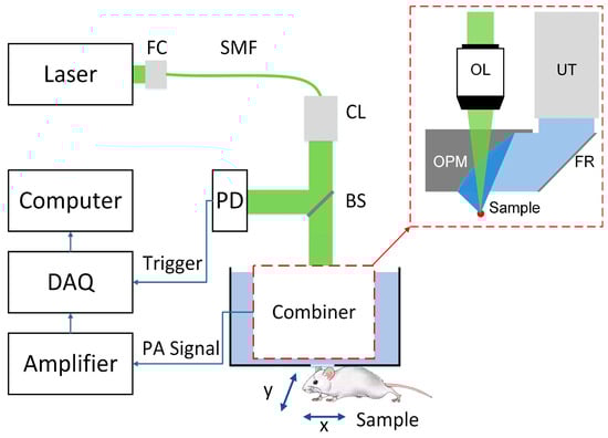 Schematic diagram of optical-resolution photoacoustic microscopy (OR-PAM) setup. FC: fiber coupling, SMF: single mode fiber, CL: collimating-mirror, BS: beam splitter, PD: photodiode, DAQ: data acquisition. Dotted box gives the details of the optical–acoustic combiner. OL: objective lens, OPM: off-axis parabolic acoustic mirror, UT: ultrasonic transducer, FR: flat acoustic reflector.