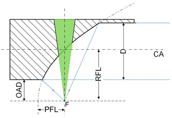 Profile map of the OPM, CA: central axis, D: diameter; OAD: off-axis distance; PFL: parent focal length; RFL: reflected focal length.