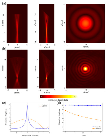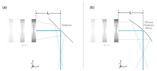 Numerical simulations were applied to examine the acoustically focusing ability of the combiner. We computed the sound pressure with the Rayleigh Integral in MATLAB (R2019b, Mathworks, Natick, MA, USA). Figure 3 shows the two different schemes to achieve acoustic focusing. One was achieved by a spherically focused ultrasonic transducer and a flat acoustic reflector []. Another one was achieved by an unfocused transducer and the proposed combiner. The surface sensitivity of the transducer was set as the same with each other. The two transducers had the same element size of 12 mm and the same central frequency of 15 MHz. Moreover, the focuses were both fixed at the same position (14 mm below the central axis). During this process, the flat acoustic mirror and the focus remains stationary and the transducer’s position was adjusted along the central axis of the OPM to fix the focus at the same position. This meant that the focus was maintained 14 mm under the central axis. The distance L between the transducer and the mirror center was 10 to 30 mm in the following simulation. For the spherically focused transducer, its focal length varied from 24 mm to 44 mm, in order to keep consistent with the set position. The surrounding media is water, in which the speed of sound is 1500 m/s.