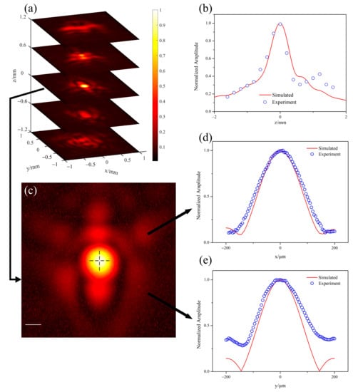 Measurement of acoustic field experiment of the combiner. (a) Five images around the focus. (b) Normalized acoustic pressure along the acoustic axis, where blue empty dots represent experiment results and the red solid line is the simulative data. (c) The image obtained on the focal plane. Two black dashed lines marked profiles at the focus along x direction and y direction. The white scale bar in the figure represents 200 μm. (d,e) Profiles along x direction and y direction in (c).