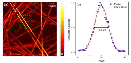 Imaging of the carbon fiber. (a) MAP image of the carbon fibers. The green dashed rectangle is the sampling region. (b) Profile along the x-direction of the carbon fiber, indicated by the white arrow in (a). MAP: maximum amplitude projection.