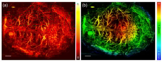 PA imaging of the brain vasculatures of a mouse through an intact skull. (a) The normalized MAP image of the brain vasculature. (b) The depth-encoded image of the brain vasculatures. The scale bar in the figure represents 1 mm. PA: photoacoustic.