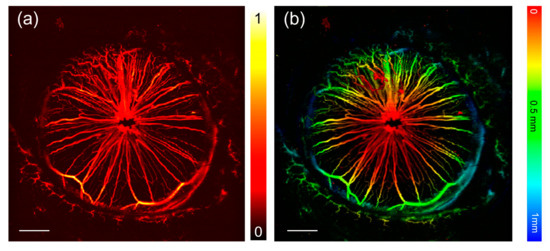 Figure 8 gives PA image of the iris of a live mouse. The region of interest was 4 × 4 mm and is scanned with a step size of 5 μm. As shown in Figure 8a, microvasculatures of the iris and the surrounding tissues can be clearly observed. Also, extracting the time delay of the PA signal at each position, an image encoded the depth information is given in Figure 8b. In the figure, the main body of the radial vascular network and branch microvasculatures distributed in the outer ring of the iris is clearly shown.