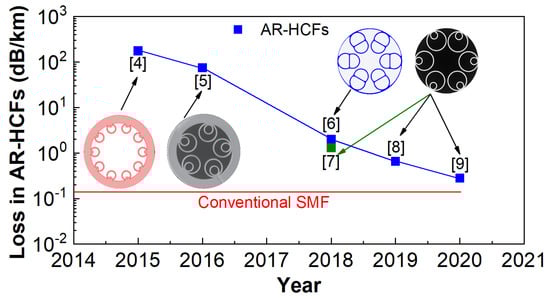 Recently, AR-HCFs with variously irregular cladding structures have been designed and fabricated to reduce transmission loss, and the hollow-core nested anti-resonant nodeless fiber (HC-NANF) is the most common [3]. Figure 1 shows the gradually decreasing transmission loss of AR-HCFs in the past five years. In 2015, Walter Belardi from the University of Bath demonstrated the attenuation of hollow-core anti-resonant fiber (HC-ARF) of 175 dB/km at 480 nm [4]. The year after, a hollow-core revolver fiber with a double-capillary reflective cladding was reported by A. F. Kosolapov et al., which reduced the transmission loss to 75 dB/km at 1850 nm [5]. In 2018, Wang et al. proposed a hollow-core conjoined-tube negative-curvature fiber with a low transmission loss of 2 dB/km at 1512 nm and a <16 dB/km bandwidth spanning across the O, E, S, C, L telecom bands (1302–1637 nm) [6]. Subsequently, based on HC-NANF, Thomas D. Bradley et al. achieved lower transmission losses of 1.3 dB/km [7] and 0.65 dB/km [8] corresponding to the transmission distance of 0.5 km and 1.2 km, respectively. Quickly, they reported that using HC-NANF reached the currently lowest attenuation of 0.28 dB/km over the C and L bands [9]. The transmission loss of HC-NANF is approaching the conventional SMF, which is located in the same order of magnitude. Additionally, the nonlinearities of AR-HCFs are 3~4 orders of magnitude lower than SMF, resulting in ultralow dispersion. On the basis of ultralow transmission loss and chromatic dispersion, Lumenisity limited experimentally demonstrated that HC-NANF realized 10 Gbit dense wavelength division multiplexing (DWDM) transmission over 10 km links [10]. Nevertheless, AR-HCF-based novel fiber devices still have a long way to overcome the difficulties of ultra-long transmission distance. Moreover, AR-HCFs also face limitations of volume production and preparation technology. Though AR-HCFs have unsolved issues in fiber communications, they have shone in optical fiber sensing applications owing to their unique anti-resonant effect and inline hollow-core platform.